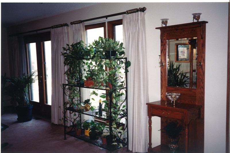 Here are a couple more views of the "area". There really wasn't a lot we could do with it except decorate it. Needless to say, we liked plants. Chris was better with them than me, but that's like saying Michael Jordan is better at dunking the ball than me. I'm not good with plants. Apparently, they need sun and water to grow and stay alive. Who knew? Every part of this house had large exterior windows so there was always plenty of light. By now you've probably also noticed we liked oak.