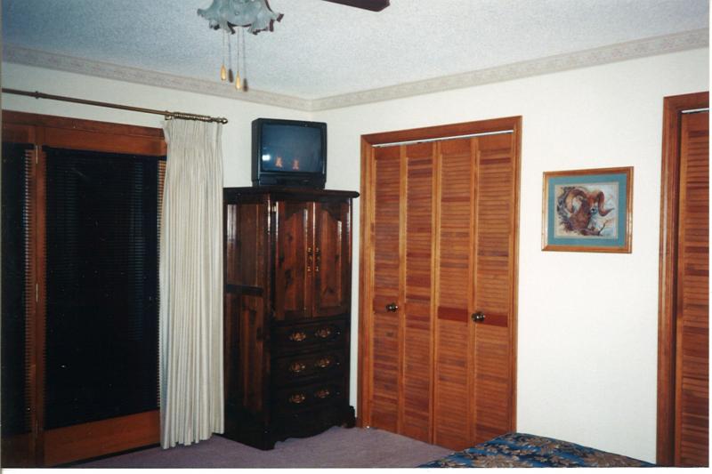 You can see two closets in these two pictures of the master bedroom. Originally, the closet to the MBR was smaller and at the other end of the room. I built an addition so that we had his/hers matching walk-in closets. I should have left the doors to one of them open to show the customization, but you get the idea. You can also see the doors to the deck.